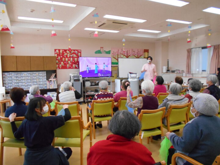2026年02月06日 ♪しゅんぺい先生の音楽レクリエーション開催♪ 今日は出張レクリエーションが開催されました。 しゅんぺい先生が画像を使って自己紹介をしたり脳トレ体操やクイズ、音楽に合わせたレクリエーションで楽しい時間を過ごしました。 最後にはしゅんぺい先生の生歌「愛燦燦」でカラフルなスカーフをペンライトのように振って皆さん大盛り上がりでした。 帰り際には握手をもとめる利用者さんも!しゅんぺい先生ありがとうございました。また来てくださいね(利用者さんからの声)♪